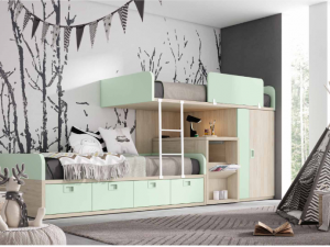 Composición dormitorio juvenil 504 de la colección UP18 fabricado en melaninas de 19 y 35 mm de varios colores. Esta compuesta por base cama block, armario block 2p asimetrio, trasera soporte base cama block 100 cm, escalera metalica nido, quiamiedos madera recto abatible, nido base bicolor + 4c contendores, y arcón extraible 100 cm. COLORES COMPOSICION: Tibet river y verde nube.TIRADORES: Pop verde nube.