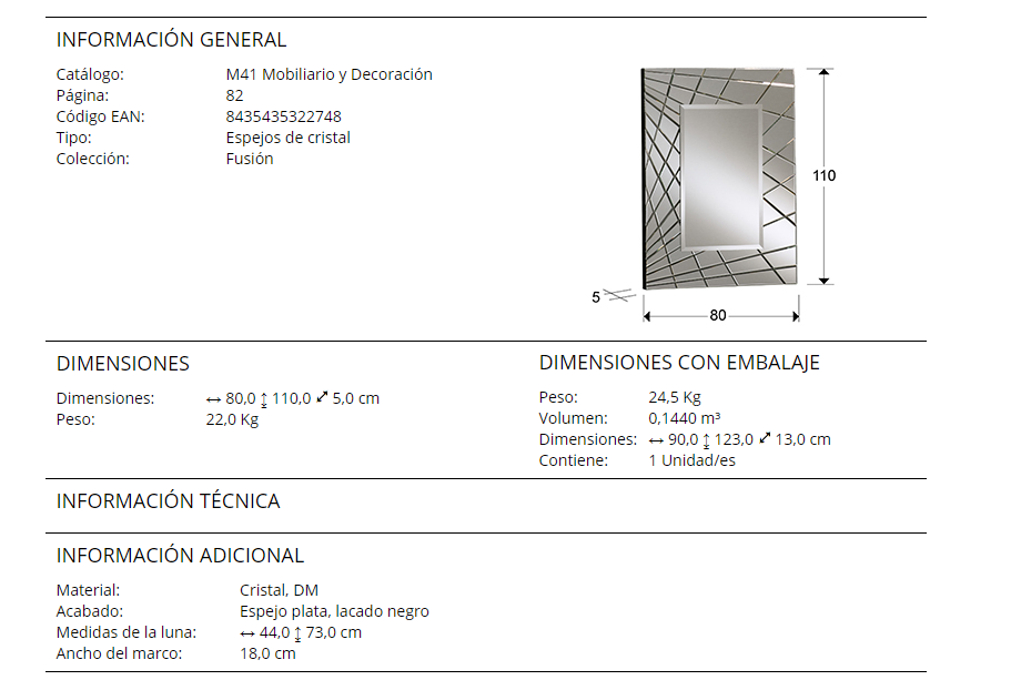Espejo FUSION de 80×110 cm. Espejo rectangular con marco de lunas biseladas. Trasera en DM acabado en color negro. Listo para colgar en posición horizontal o vertical. Luna central biselada. Ancho del marco 18 cm.