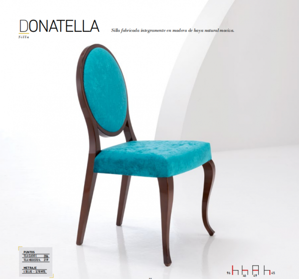 Silla de diseño mod. DONATELLA de estilo isabelino de 49x46x96 en madera de haya. Lo mejor de esta silla es la posibilidad de pintarla en cualquier color a juego con mobiliario de cualquier fabricante, igualmente con las telas a elegir de cualquier marca, el asiento es de espuma de alta densidad, 2 años de garantía y disponible en sillón, consultar precio.