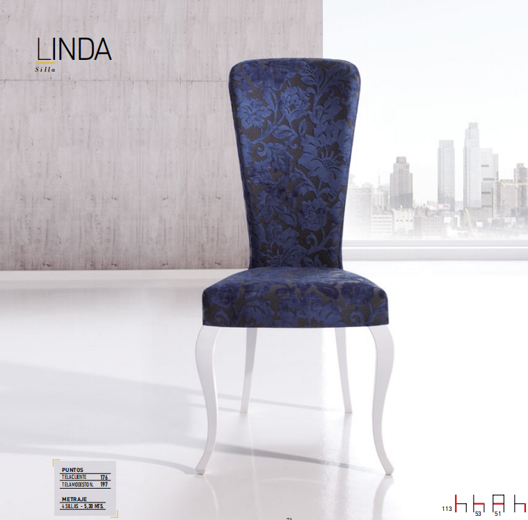 Silla de diseño mod. LINDA de estilo isabelino de 51x53x113 en madera de haya. Lo mejor de esta silla es la posibilidad de pintarla en cualquier color a juego con mobiliario de cualquier fabricante, igualmente con las telas a elegir de cualquier marca, el asiento es de espuma de alta densidad, 2 años de garantía y disponible en sillón, consultar precio.
