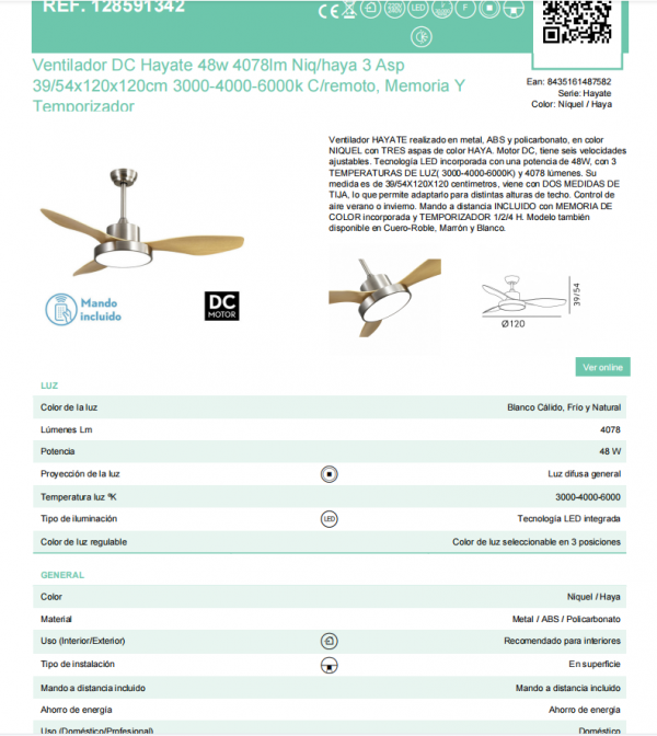 Ventilador HAYATE realizado en metal, ABS y policarbonato, en color NIQUEL con TRES aspas de color HAYA. Motor DC, tiene seis velocidades ajustables. Tecnología LED incorporada con una potencia de 48W, con 3 TEMPERATURAS DE LUZ( 3000-4000-6000K) y 4078 lúmenes. Su medida es de 39/54X120X120 centímetros, viene con DOS MEDIDAS DE TIJA, lo que permite adaptarlo para distintas alturas de techo. Control de aire verano o invierno. Mando a distancia INCLUIDO con MEMORIA DE COLOR incorporada y TEMPORIZADOR 1/2/4 H. Modelo también disponible en Cuero-Roble, Marrón y Blanco.